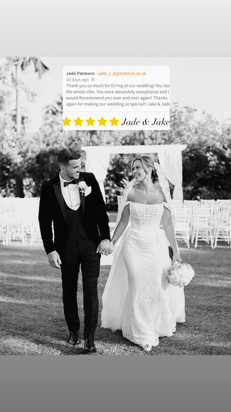 Thank you so much for DJ’ing at our wedding! You bought the whole vibe. You were absolutely exceptional and I would Recommend you over and over again! Thanks again for making our wedding so special!! Jake & Jade